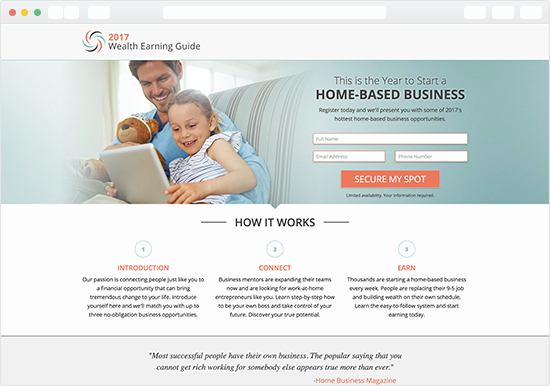 These exclusive Phone Verified Leads not only responded online to one of our home business request forms, but were also called and interviewed by one of our professional call center representatives. Our phone interviewed process verifies the prospects interest level in starting a home-based business, and confirms they have a valid credit card, and money to invest to get started.